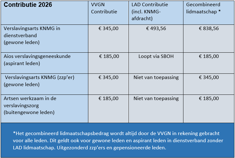 De VVGN int de contributie voor het LAD-lidmaatschap en draagt deze vervolgens af aan de LAD. De hoogte van de LAD-contributie in 2026 bedraagt € 493,56 voor verslavingsartsen KNMG. De contributie is inclusief de KNMG-afdracht.